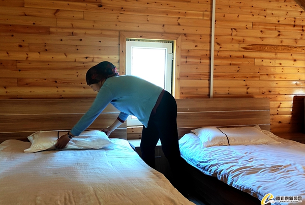 村民哈布勒汗·汗吉哈和妻子十几年前就在牧民转场路上开小饭馆谋生,做生意小有经验,又勤劳能干,被驻村工作队和村“两委”纳入首批发展农家乐名单,先后让他们参加烹饪、面点和家庭旅馆等技能培训,提高了他们职业技能。2017年政府补贴帮助他们建了两层特色木头房子,帮他们申请小额扶贫贷款解决了创业资金问题。就这样,哈布勒汗·汗吉哈家成为村里首个搭上发展全域旅游顺风车、带头开民宿谋致富的先行者。