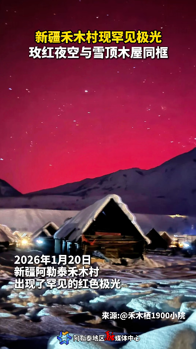 新疆禾木村现罕见极光 玫红夜空与雪顶木屋同框