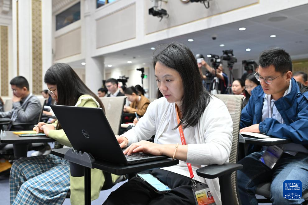 9月29日,国务院新闻办公室在北京举行“高质量完成‘十四五’规划”系列主题新闻发布会,水利部部长李国英、水利部副部长陈敏、水利部规划计划司司长张祥伟、水利部水资源管理司司长于琪洋介绍“十四五”时期水利高质量发展成就,并答记者问。这是记者在现场工作。新华社记者 李鑫 摄