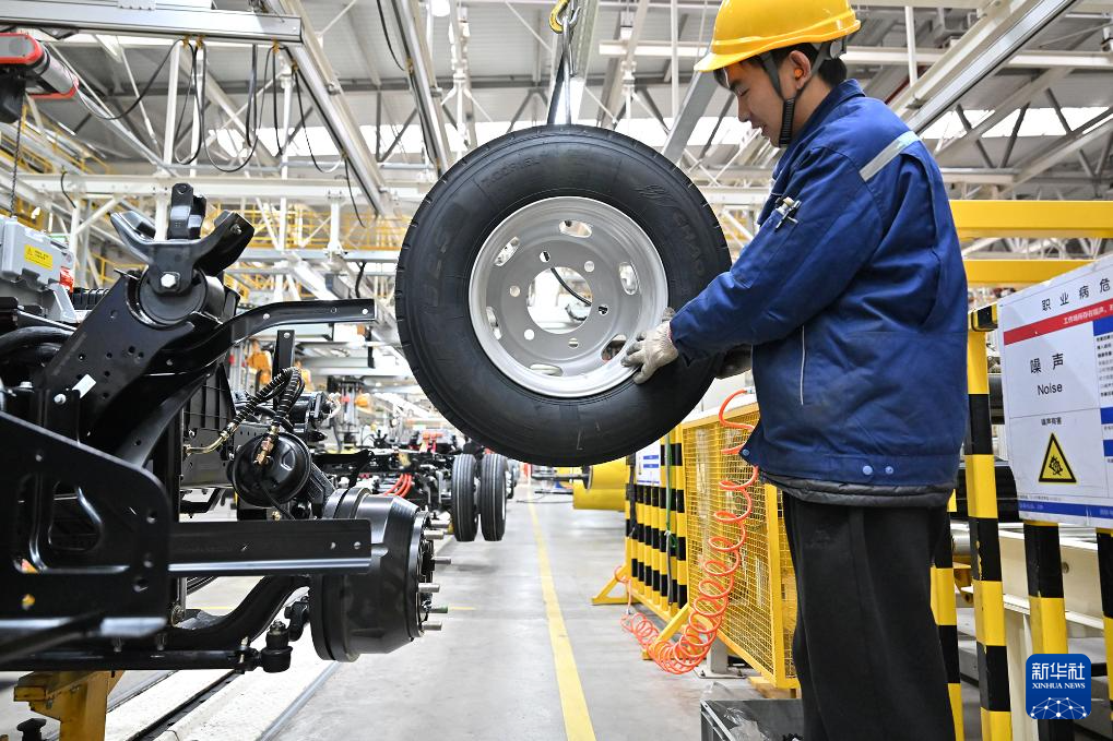 2025年12月12日,在河南省商丘市豫商经济技术开发区一家新能源汽车企业,工人在新能源轻卡车生产线上赶制产品订单。新华社发(李恒 摄)