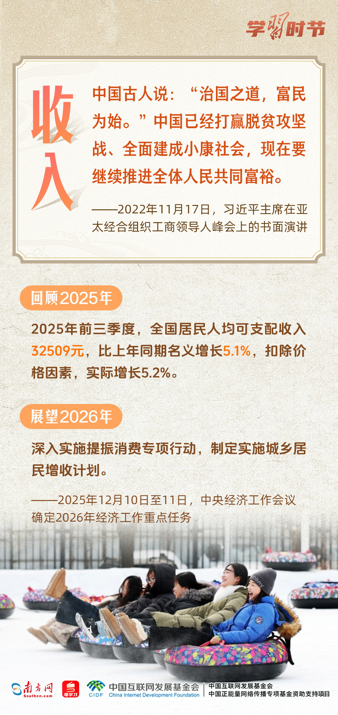 民生无小事,枝叶总关情。习近平主席始终关心千万“小家”的幸福冷暖,强调“家事国事天下事,让人民过上幸福生活是头等大事”。2025年末召开的中央经济工作会议将“坚持民生为大,努力为人民群众多办实事”列入2026年经济工作重点任务之一。收入、粮食、就业、教育……2026年经济工作“路线图”中,藏着“小家”的烟火日常。