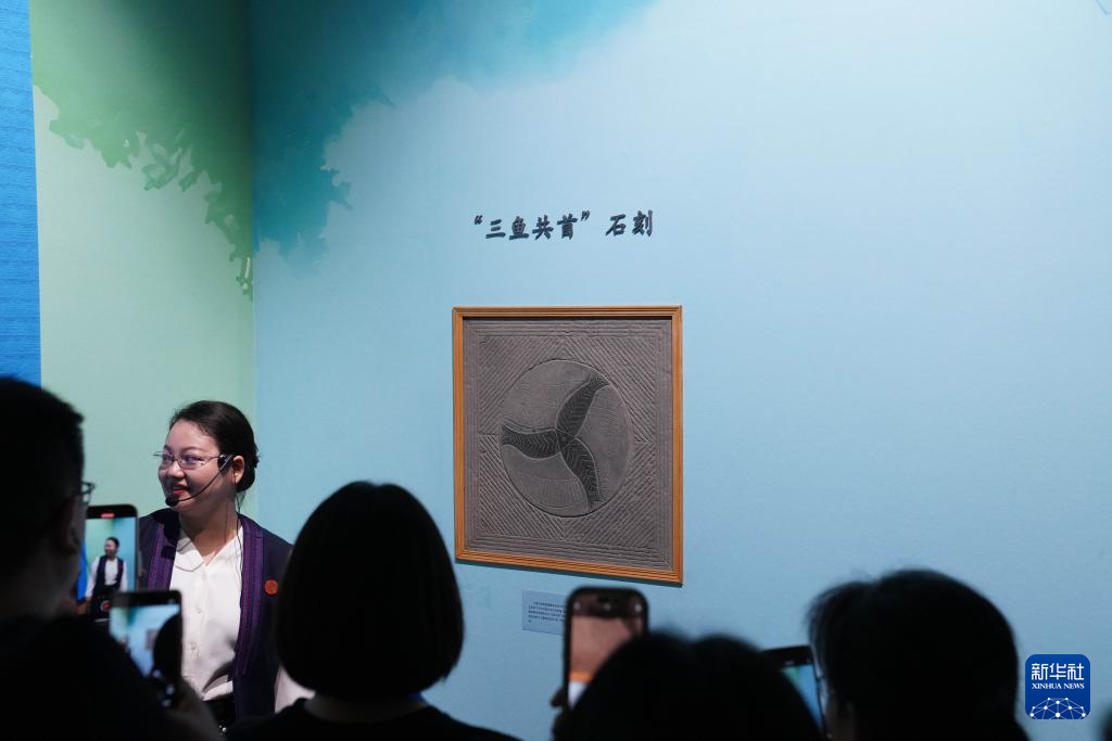 8月24日,讲解员在位于南宁的广西民族博物馆“铸牢中华民族共同体意识历史文化展”上介绍“三鱼共首”石刻图案 。新华社记者 尹栋逊 摄