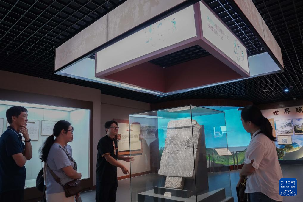 8月25日,在位于广西金秀的瑶族博物馆,馆长盘威(右二)向游客介绍《大瑶山团结公约》石碑。新华社记者 尹栋逊 摄