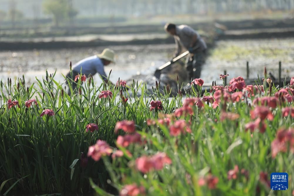 4月20日,在云南省腾冲市和顺镇大庄社区香藕园,农民在荷塘里加固堤坝。新华社发(龚祖金摄)