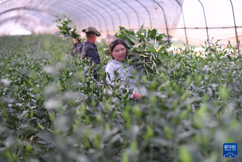 4月20日,在云南省文山壮族苗族自治州文山市马塘镇花卉种植基地,花农在管理、采收百合花。新华社发(熊平祥摄)