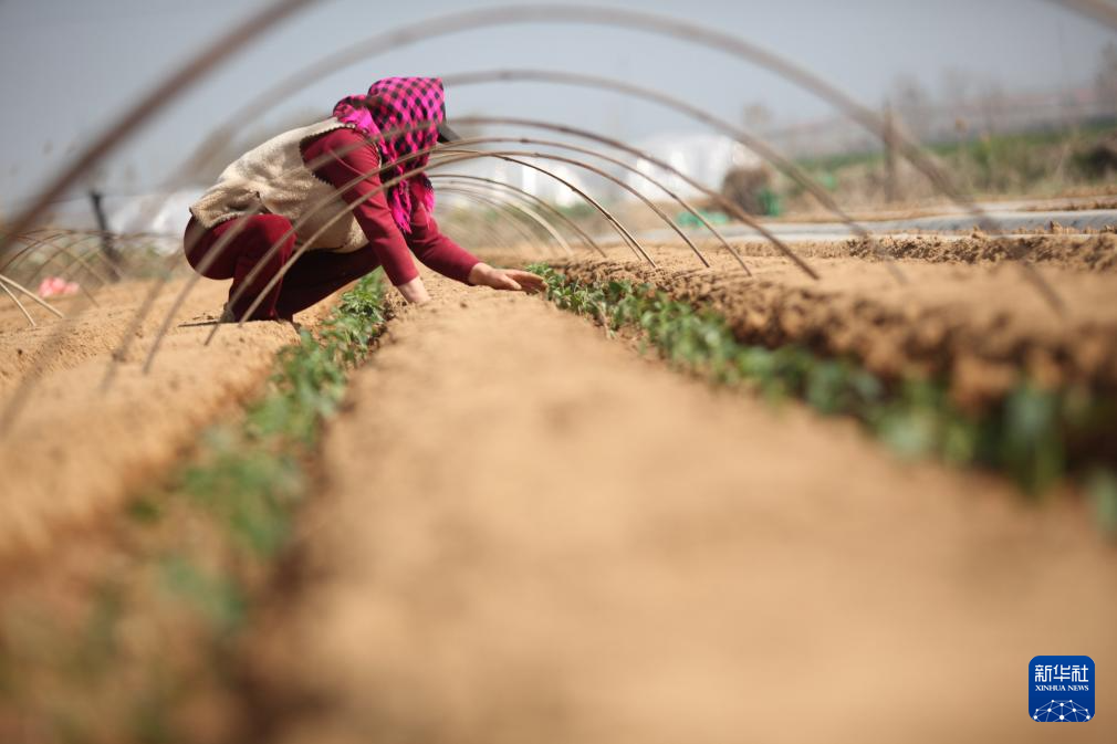 4月20日,在山东省威海市文登区泽头镇东团岚埠村的一处田地里,农户在栽植辣椒苗。新华社发(陈宏青摄)