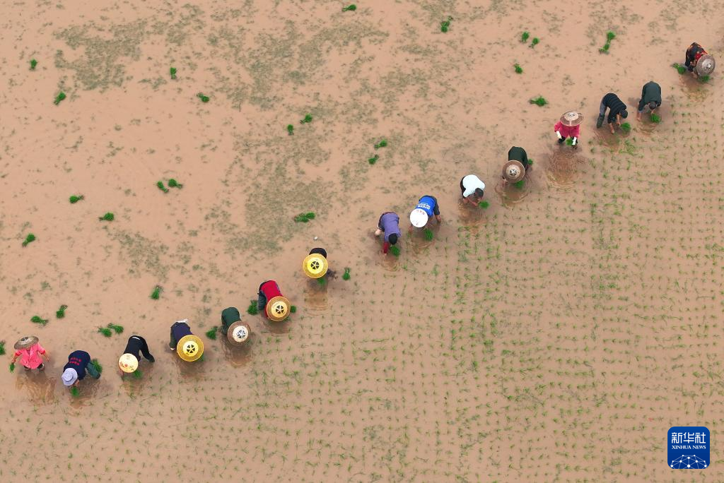 4月20日,在湖南省衡阳市祁东县金桥镇,当地村民在进行早稻插秧作业(无人机照片)。新华社发(曹正平摄)