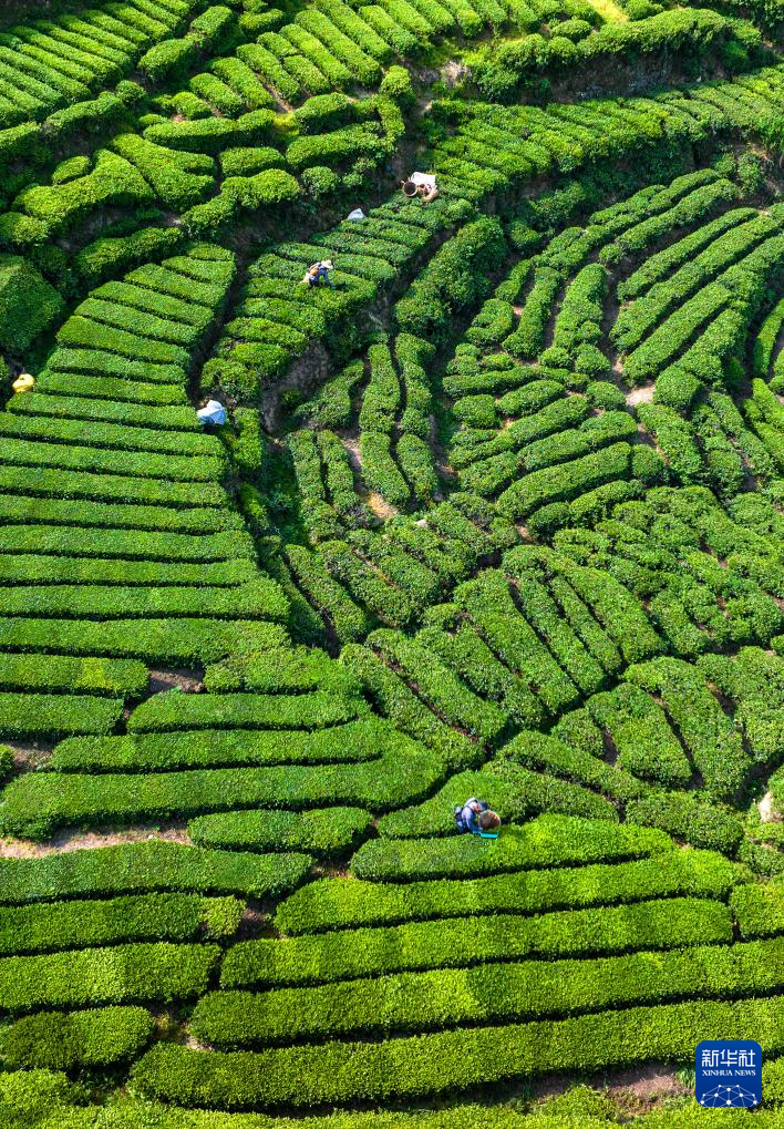 4月20日,湖北省宜昌市秭归县茅坪镇长岭村的村民在茶园采茶(无人机照片)。新华社发(王罡摄)