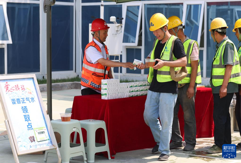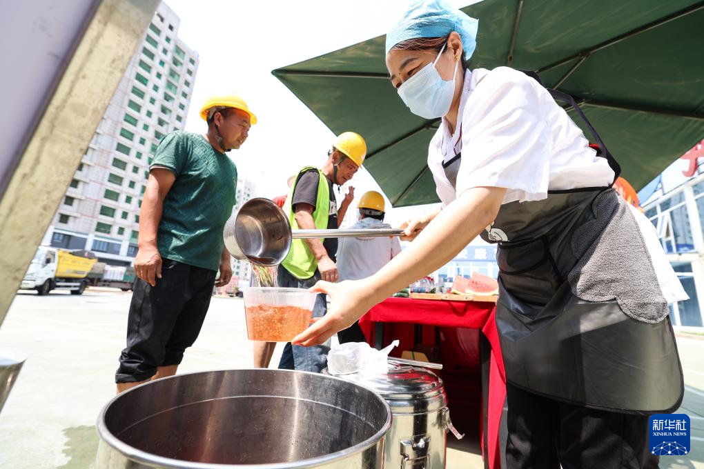 6月11日,在河北省石家庄市新华区西营城中村改造项目施工现场,工作人员为建筑工人盛绿豆汤。新华社发(梁子栋摄)