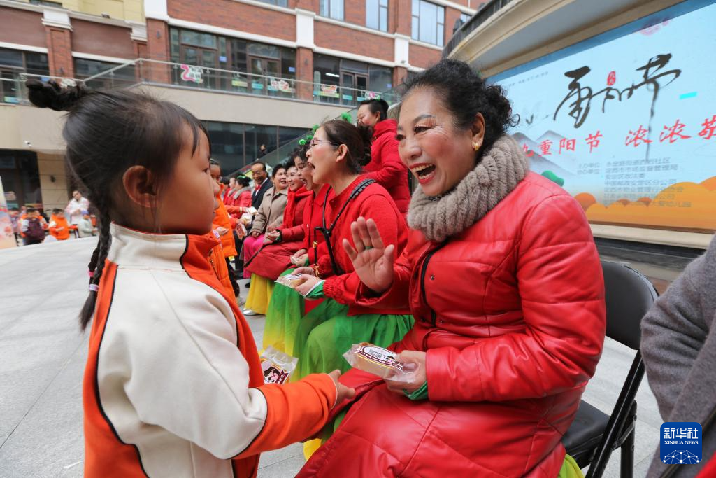 10月28日,小朋友和社区老人在甘肃省定西市安定区永定路街道举办的重阳节主题活动中互动。新华社发(王克贤摄)