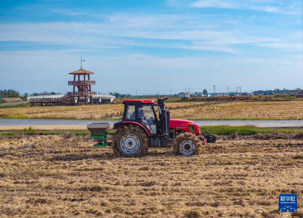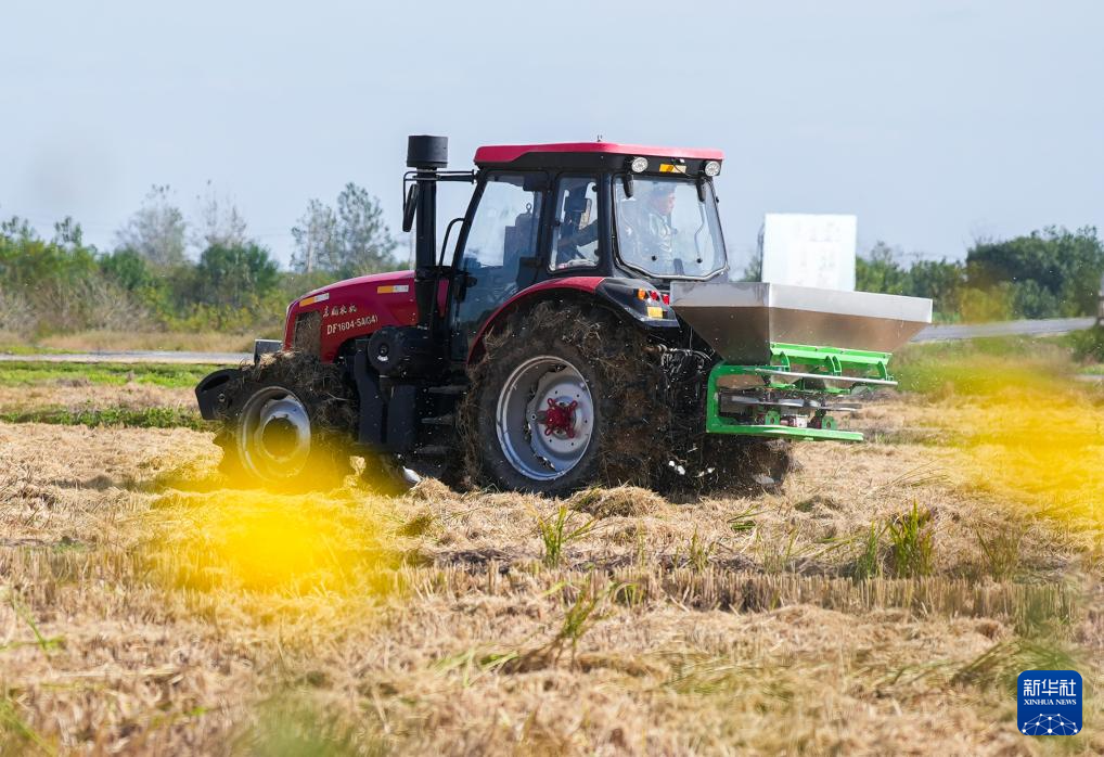 11月3日,农民驾驶农机在江苏省兴化市兴东镇周韩村田间施肥,为冬小麦播种做准备。新华社发(周社根 摄)
