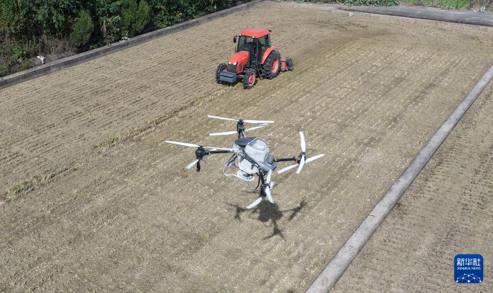 11月3日,植保无人机在位于江苏扬州的江苏里下河地区农科所(扬州市农科院)进行播种冬小麦前的施肥作业(无人机照片)。新华社发(孟德龙 摄)