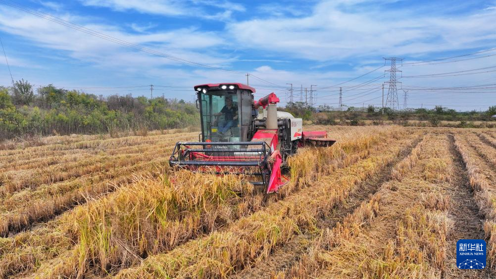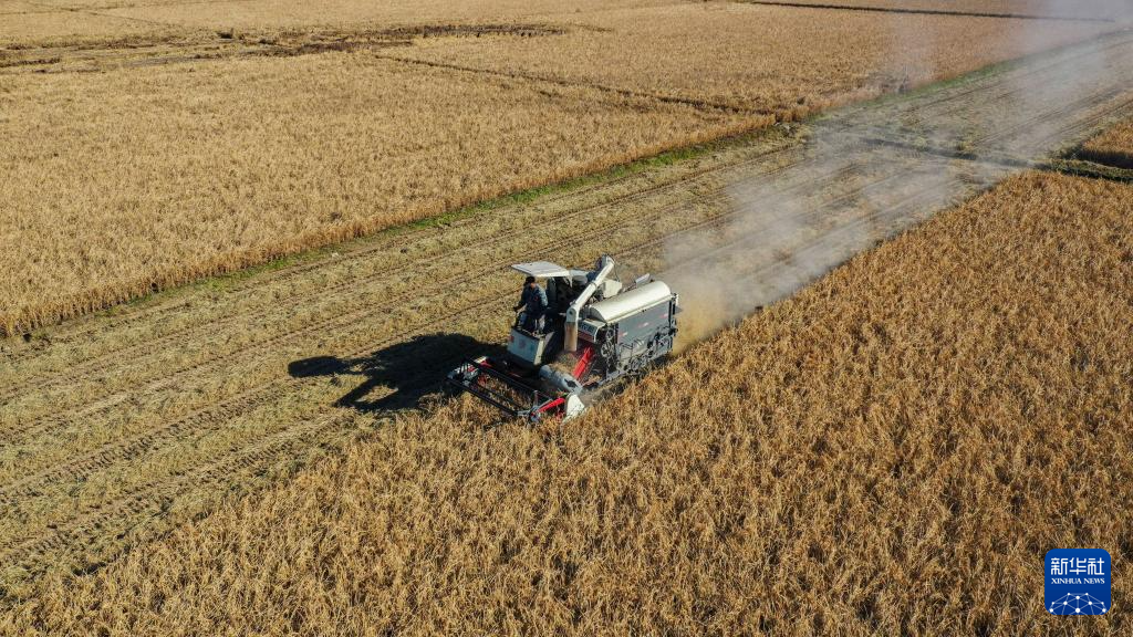 11月3日,在安徽省合肥市蜀山区小庙镇段冲村,农机手驾驶收割机在田间收割水稻(无人机照片)。新华社发(陈三虎 摄)