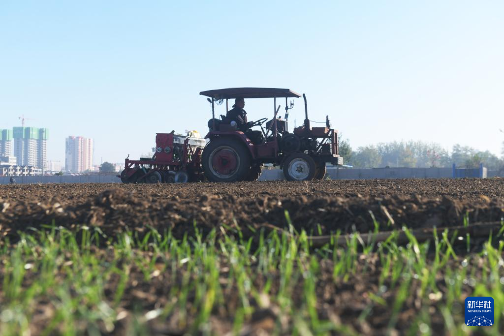 11月1日,在河北省石家庄新乐市长寿街道办事处东名村,农民驾驶农机播种冬小麦。新华社发(贾敏杰 摄)