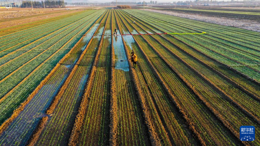 11月3日,河北省遵化市东新庄镇农民在麦田浇水(无人机照片)。新华社发(刘满仓 摄)