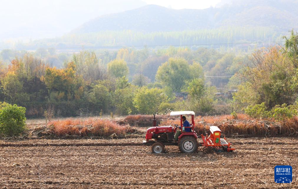 11月3日,在河北省石家庄市井陉县威州镇东街村田地,农户驾驶农机播种冬小麦。新华社发(梁子栋 摄)
