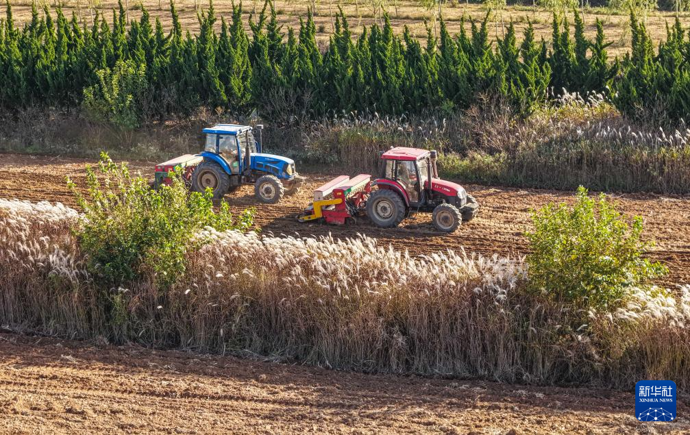 11月3日,在山东省临沂市郯城县郯城街道,农民播种冬小麦(无人机照片)。新华社发(张春雷摄)
