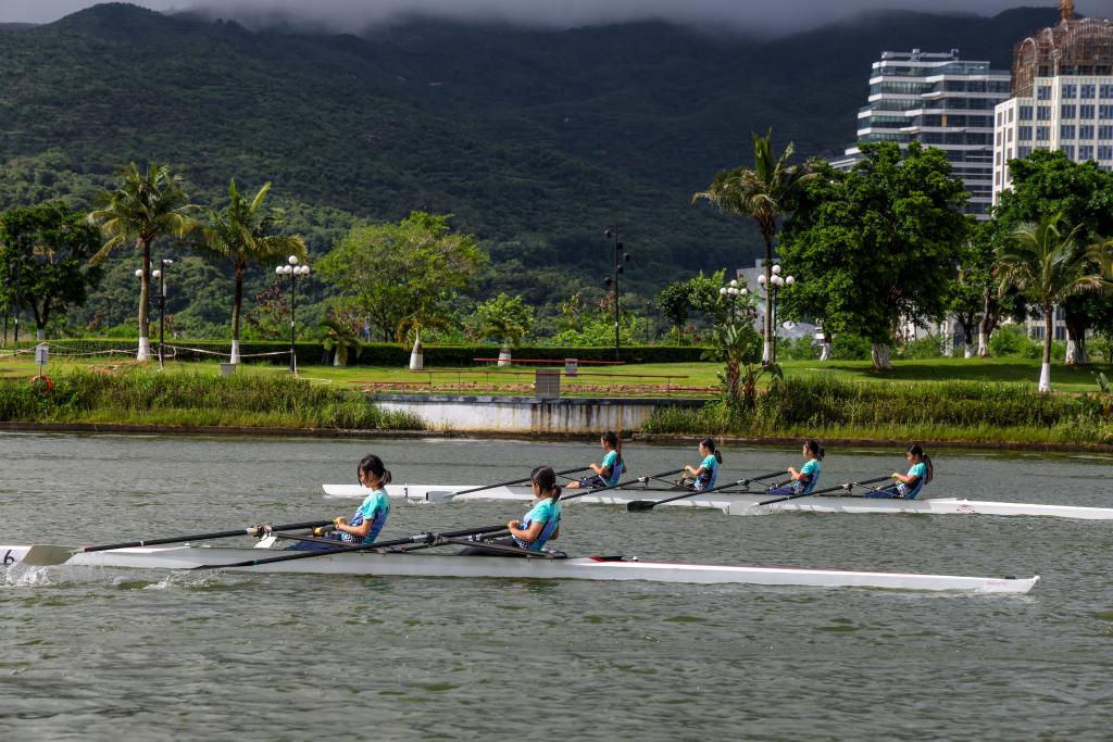 2025年6月21日,青少年在横琴天沐河上进行赛艇训练。新华社记者 毛思倩 摄