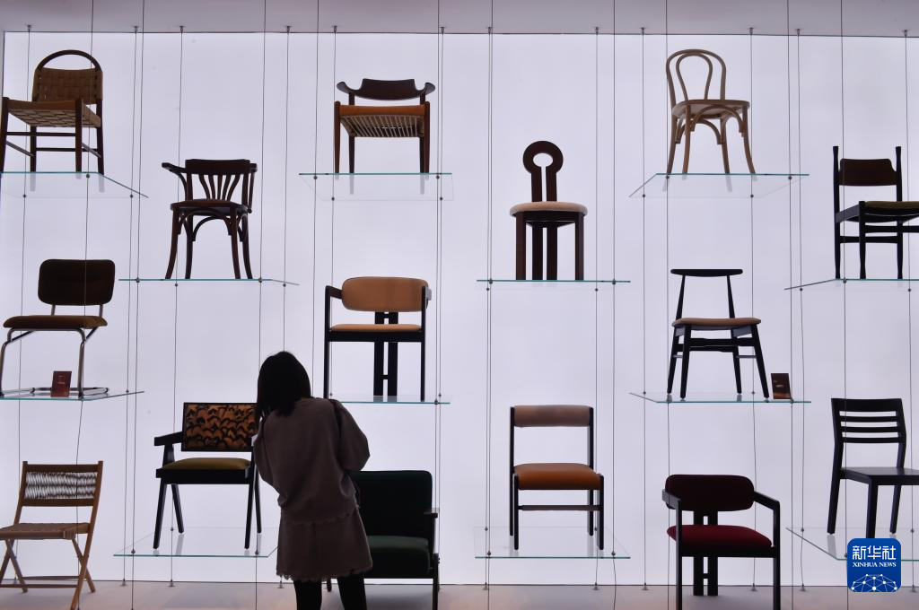 11月6日,观众在第八届进博会江西赣州展厅参观展出的各式椅子。新华社记者 鲁鹏 摄