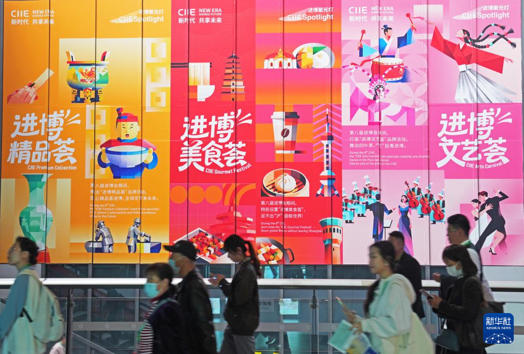 11月8日,在国家会展中心(上海),观众走过“进博精品荟”“进博美食荟”“进博文艺荟”的巨幅海报。新华社记者 刘颖 摄
