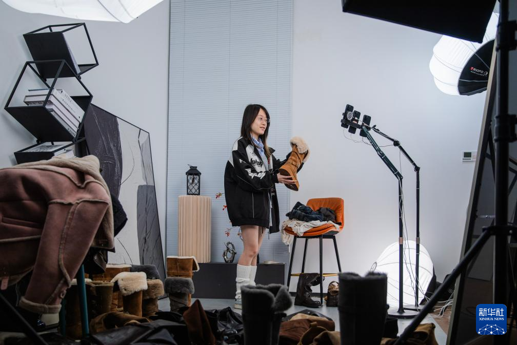 11月10日,在浙江省温州市瓯海区的一家网络科技公司,主播通过网络直播销售鞋子。新华社发(刘吉利摄)
