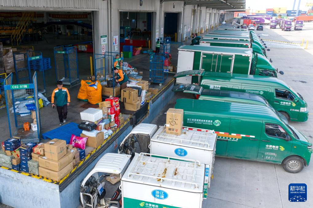 11月10日,在浙江省湖州市长兴县三点一线商贸物流共配中心,工作人员忙着将快递装车外运。新华社发(谭云俸摄)