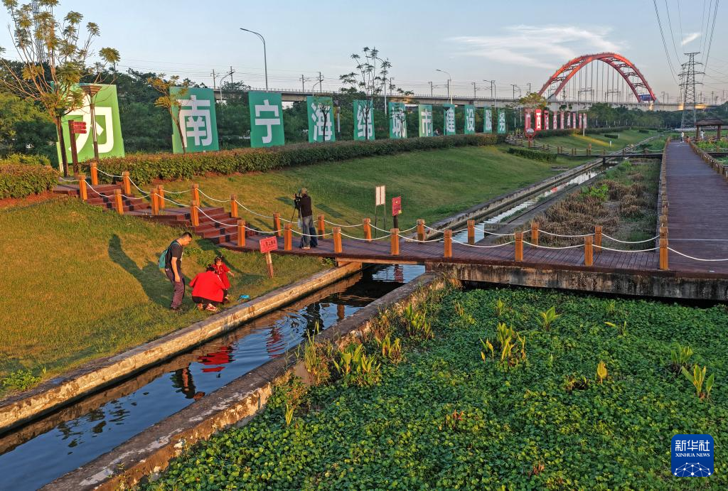 市民在广西南宁市那考河湿地公园游玩(11月14日摄,无人机照片)。新华社记者 周华 摄