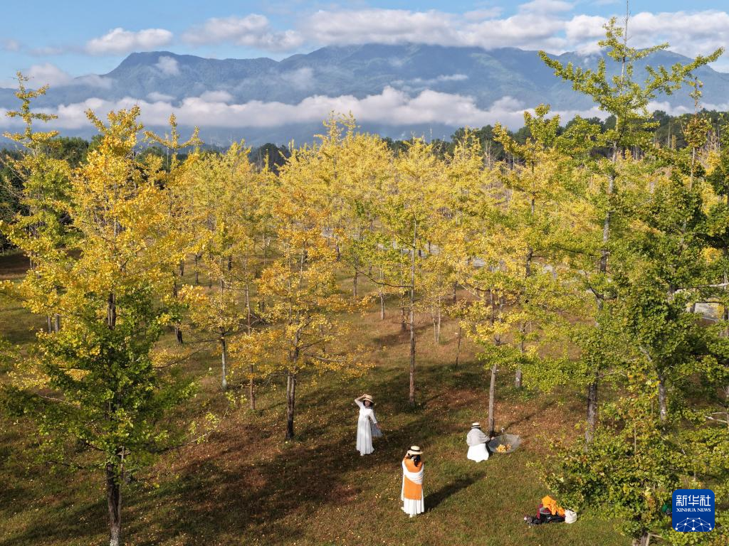 11月14日,游人在湖南省永州市双牌县茶林镇桐子坳村古银杏林赏景游玩(无人机照片)。新华社发(周秀鱼春摄)