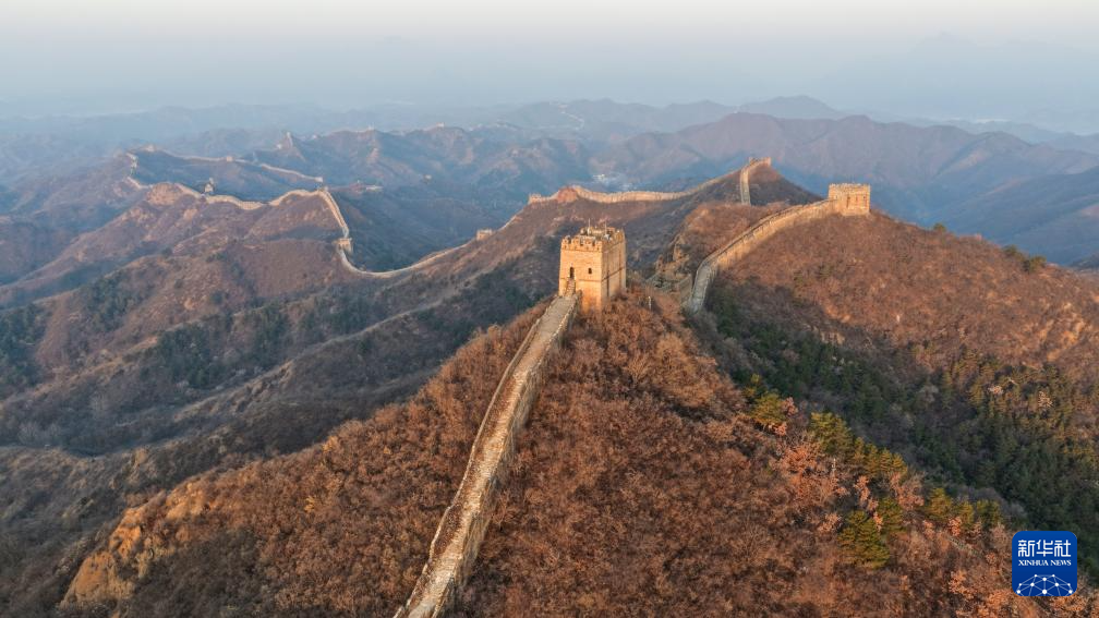 11月15日拍摄的晨光映照下的河北省承德市滦平县金山岭长城(无人机照片)。新华社发(周万平摄)