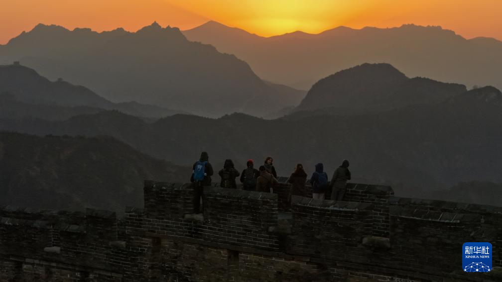 11月15日清晨,游人在河北省承德市滦平县金山岭长城观看日出(无人机照片)。新华社发(周万平摄)
