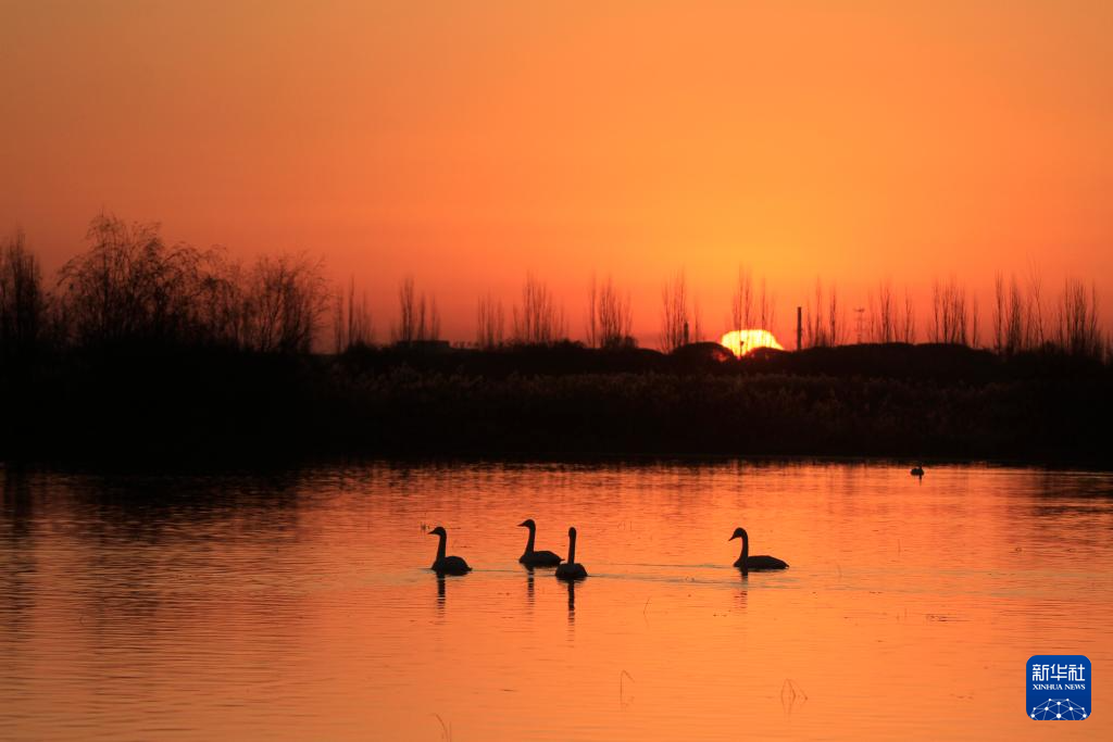 11月14日,几只大天鹅在甘肃张掖国家湿地公园水面游弋。新华社发(陈礼摄)