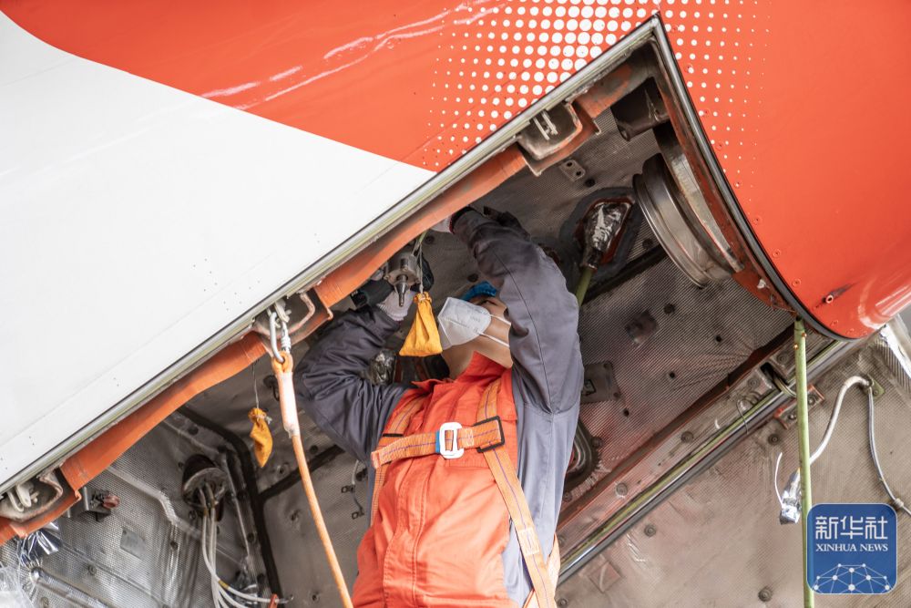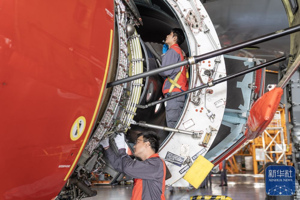 ↑ 11月21日,海航技术旗下大新华飞机维修服务有限公司的机务维修人员对进境飞机进行检修。新华社记者 张丽芸 摄