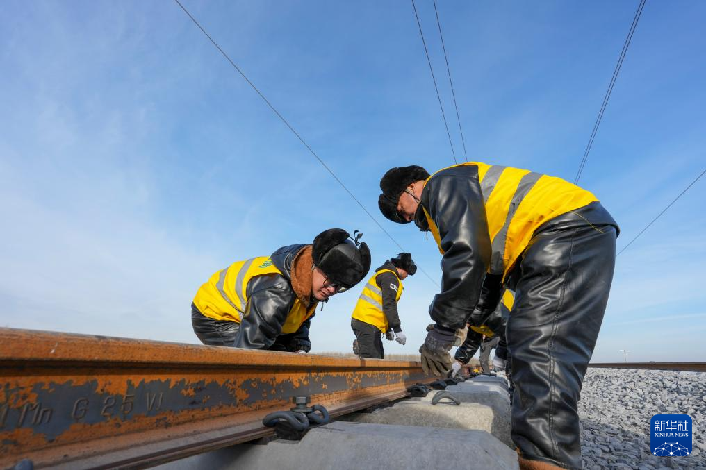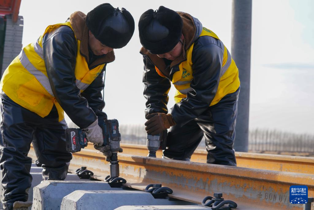 11月25日,在黑龙江省绥化市庆安县永华村哈伊高铁哈铁段铺轨现场,施工方中铁二局的四名工人手持电动扳手,将最后一对钢轨螺栓拧紧,标志着我国“十四五”重点工程哈伊高铁全线铺轨贯通,为后续联调联试奠定基础。