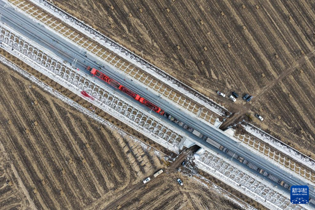 这是11月25日在黑龙江省绥化市庆安县永华村拍摄的哈伊高铁哈铁段铺轨现场(无人机照片)。新华社记者 王松 摄