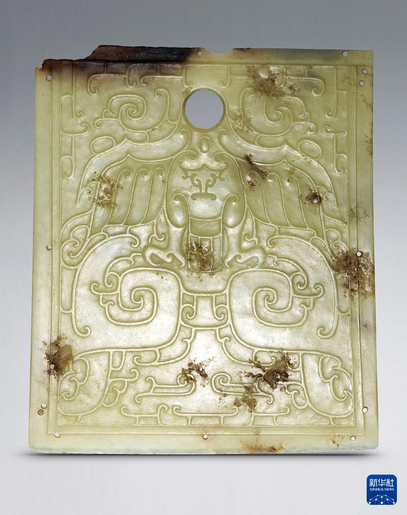 这是陕西榆林石峁遗址墓葬出土的鹰纹玉钺(正面)(资料照片)。新华社发(国家文物局供图)