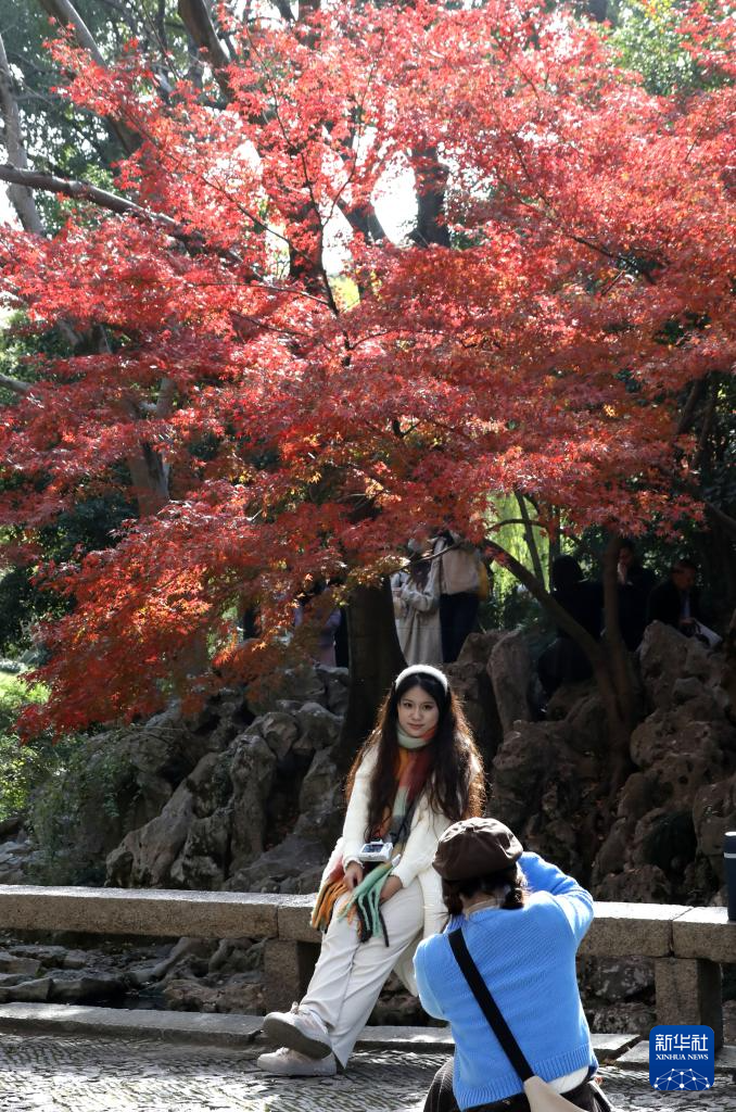 11月28日,游客在江苏苏州拙政园赏景拍照。新华社发(杭兴微摄)