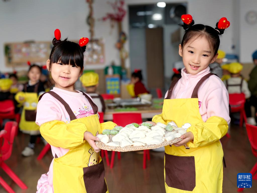 12月19日,在河南省济源市第一幼儿园,孩子们展示自己包的饺子。新华社发(段二平摄)