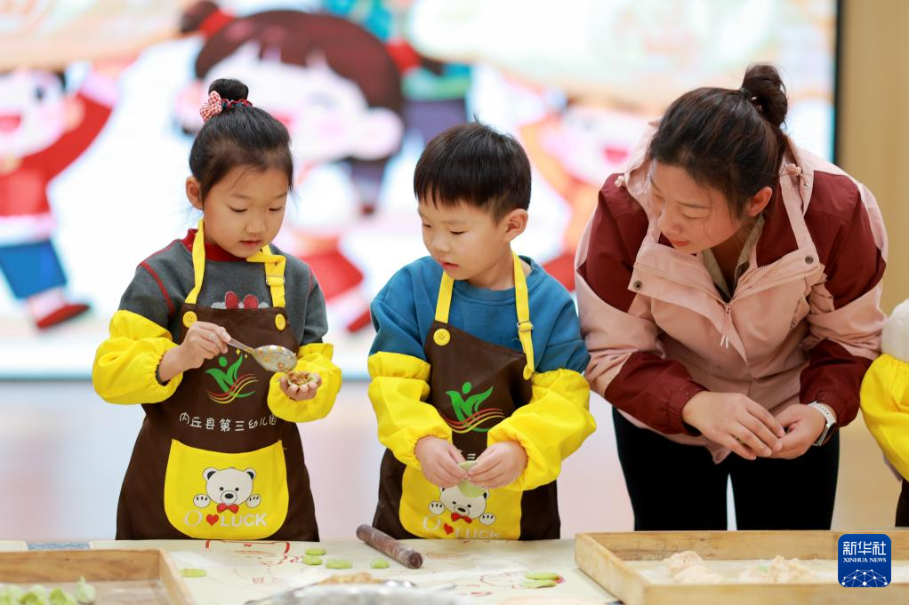 12月19日,在河北省石家庄市新华区第一幼儿园,老师指导小朋友们包饺子。新华社发(陈其保摄)
