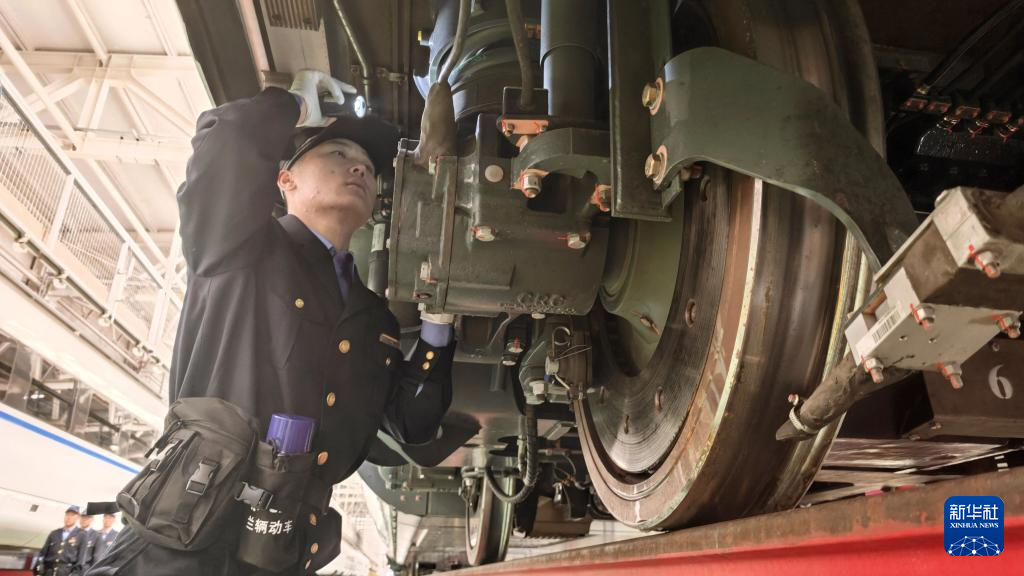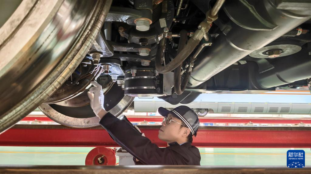 12月21日,中国铁路兰州局集团有限公司兰州车辆段银川动车运用所的工作人员对列车进行检修。他们用专业的坚守,护航每一趟列车的冬日征程,守护万千旅客的平安归途。新华社记者 邢广利 摄