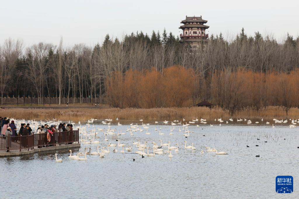 12月20日,游客在河南省三门峡市天鹅湖国家城市湿地公园观赏天鹅。新华社发(何五昌摄)