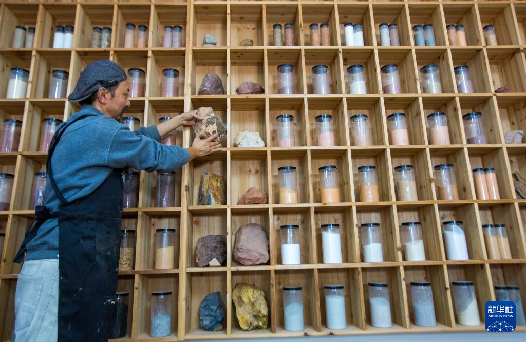 12月22日,画师在展示采集到的岩彩原料。新华社发(陈颖 摄)