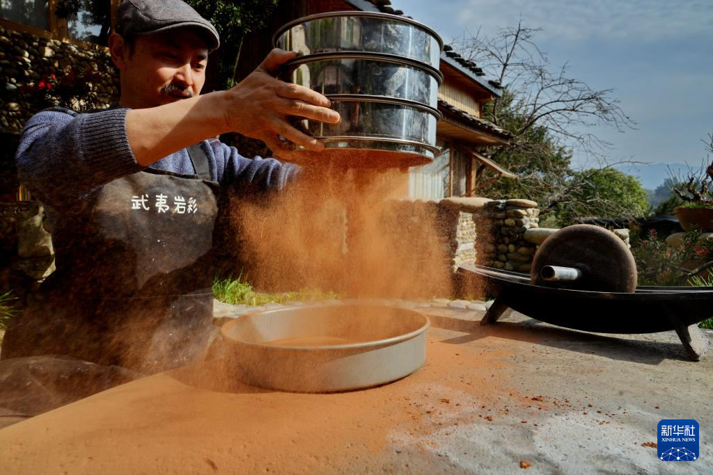 12月19日,武夷岩彩画师胡磊过筛研磨后的岩土粉末。新华社发(陈颖 摄)