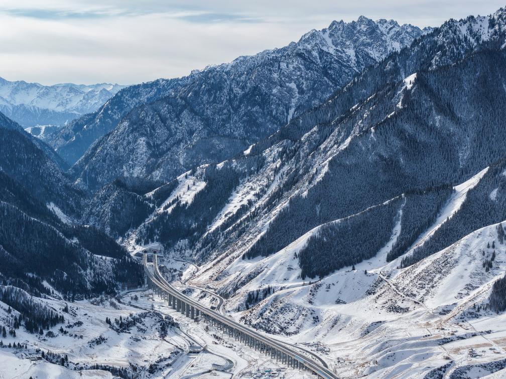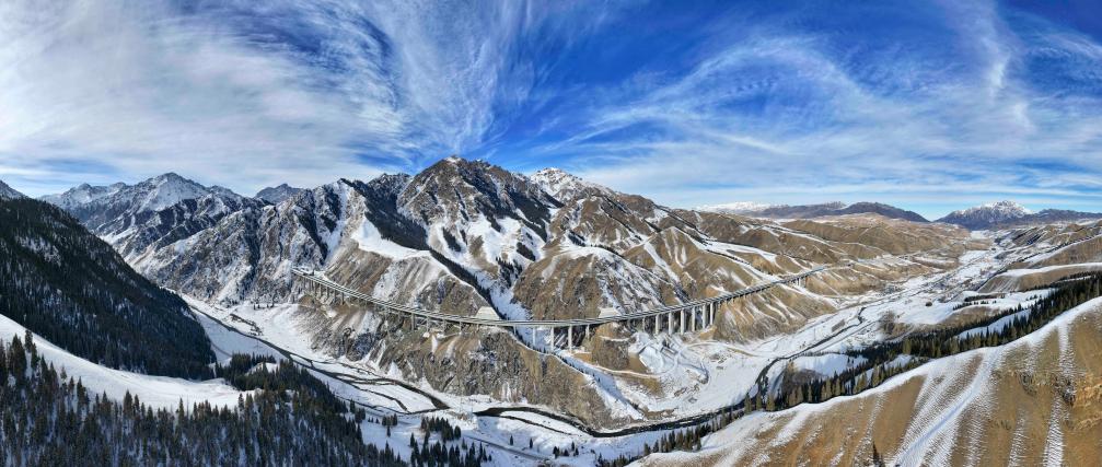 桥隧相连的乌尉高速公路穿越天山山脉(2025年12月23日摄)。新华社记者 胡虎虎 摄
