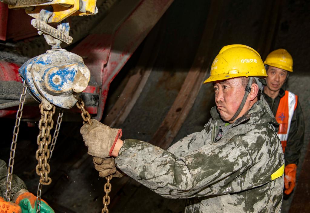 工人在天山胜利隧道中导洞内施工(2021年2月4日摄)。新华社记者 胡虎虎 摄