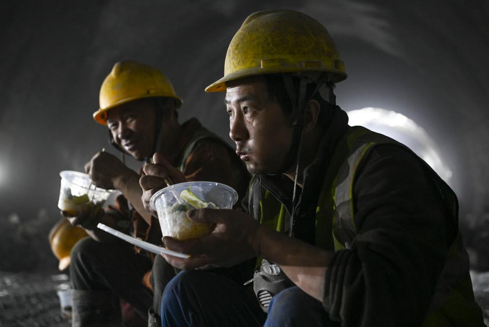 参与天山胜利隧道建设的工人杨林(右)与工友在施工现场吃午饭(2024年12月25日摄)。新华社记者 胡虎虎 摄