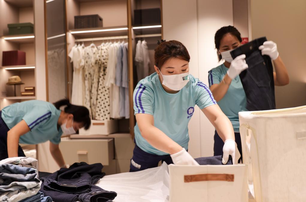 7月2日,在贵州省遵义市,整理收纳师在客户家中整理衣物。2021年,人社部发布公示,在“家政服务员”职业下增设“整理收纳师”工种,行业发展越来越规范,加入这一行业的人也越来越多。《2023-2024中国整理行业白皮书》数据显示,2023年我国接受过职业整理收纳师培训的总人数超过7.3万,较上年增长97.29%。