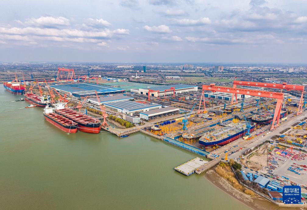12月31日,在江苏省扬州市江都区扬州中远海运重工有限公司,工人在生产厂区加紧造船(无人机照片)。新华社发(任飞摄)