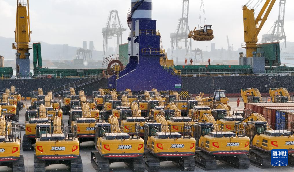 12月31日,在山东港口烟台港,烟台港至东南亚件杂货班轮在装运要出口印度尼西亚的国产工程机械(无人机照片)。新华社发(唐克摄)