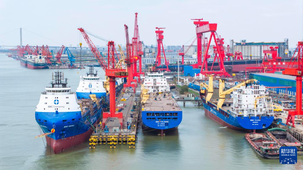 12月27日,在位于江苏省泰州市高港区的泰州三福船舶工程有限公司生产基地,多艘大型船舶在建造中(无人机照片)。新华社发(周社根摄)