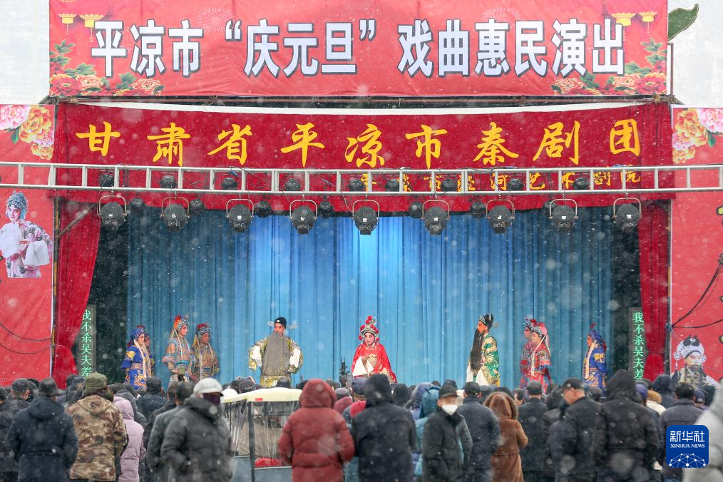 1月2日,在甘肃省平凉市崆峒区,人们冒雪观看戏曲惠民演出。新华社发(吴希会摄)